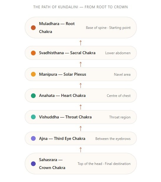 Kundalini awakening is the activation of dormant Kundalini energy at the base of the spine. Once awakened, it begins rising through the chakras toward the crown of the head. It can happen gradually through years of yoga and meditation, or in rare cases, spontaneously. When it reaches the crown chakra, it is said to bring the practitioner into union with cosmic consciousness, the highest form of spiritual realisation in yogic tradition.